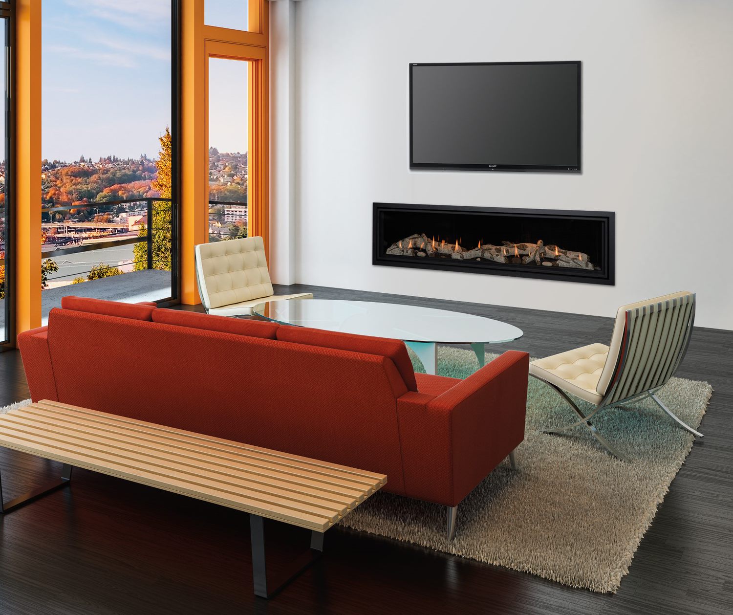 The 72”, large Callaway 72 linear fireplace will make any room stand out. It will draw attention to the beautiful flames, and your wall will become the focus of the room. And you will enter a comforting and calming haven to relax and entertain.