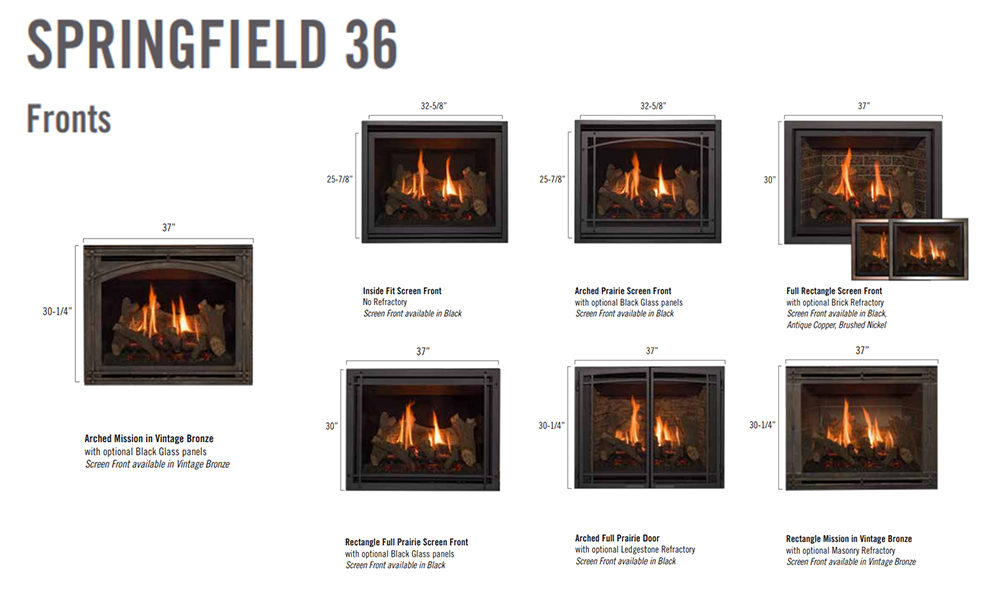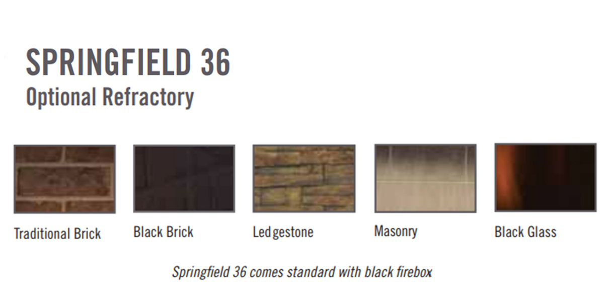 You are able to select design options for the Springfield model to tailor the look to meet your design requirements. With seven different fronts to choose from in a variety of colors, we are sure your favorite will be among them. It comes with a standard arched front, or you can add the optional rectangular format in a variety of looks combinations of black, antique copper, brushed nickel, and vintage bronze. You can also add one of five optional refractories.